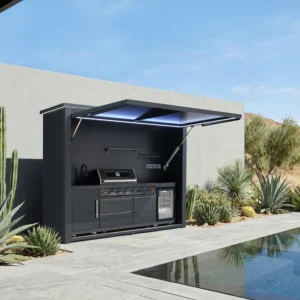 Luxury outdoor kitchen pod with remote door, range hood, TV, fridge, RGB lights, and full BBQ setup.