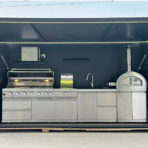 | contain | Outdoor Kitchen Pod-Aluminum Sink Unit Gas Grill Gas pizza oven Gas side burner 2 DRAWERS CABINET Range Hood |